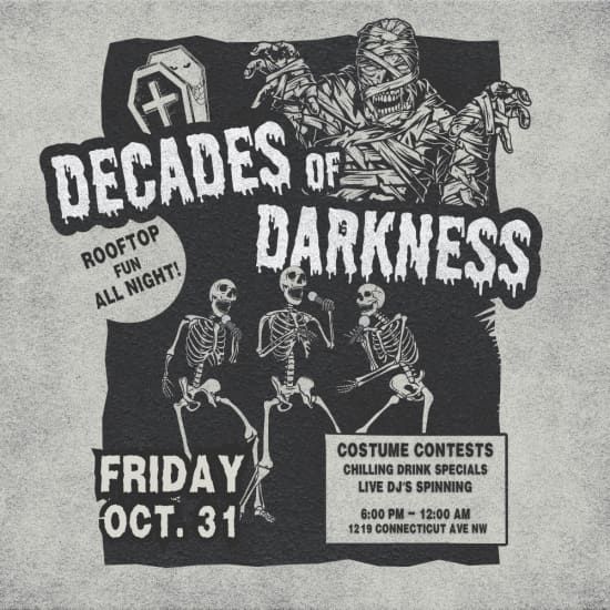 ⭐ DC’s ultimate throwback nightclub transforms for Halloween! Dance through decades of spooky hits and enjoy a multi-level haunted party at Decades on October 31 Highlights 🎶 DJs spinning hits from the ’80s, ’90s, ’00s, and today with a Halloween twist. 🍹 Spooky drink specials across multiple floors ($4 beers, $6 mixed drinks/rails, and more). 🎭 Epic costume contest with prizes for the boldest and most creative looks. 💀 Multi-level haunted décor and eerie energy throughout the club. 👻 A crowd of ghouls, ghosts, and party monsters keeping the vibes alive all night. General Info 📍 Venue: 1219 Connecticut Avenue Northwest, Washington, DC 📅 Date: Friday, October 31, 2025 ⏰ Time: 6:00 PM – 12:00 AM 👤 Age Requirement: 21+ with valid ID 👗 Dress Code: Costumes encouraged but not mandatory Description Decades of Darkness takes Halloween partying to the next level in DC. Explore multiple floors filled with spooky décor, eerie vibes, and a decade-spanning soundtrack that keeps the dance floor alive all night. Enjoy specially priced drinks, show off your best costume, and party alongside a crowd of ghosts, ghouls, and throwback enthusiasts. Get your tickets now!Event Location