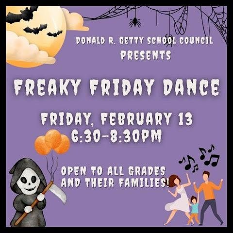 Welcome to the Donald R. Getty School Freaky Friday Dance! Get ready to dance the night away at the Donald R. Getty School on February 13, 2026 at 6:30 PM.