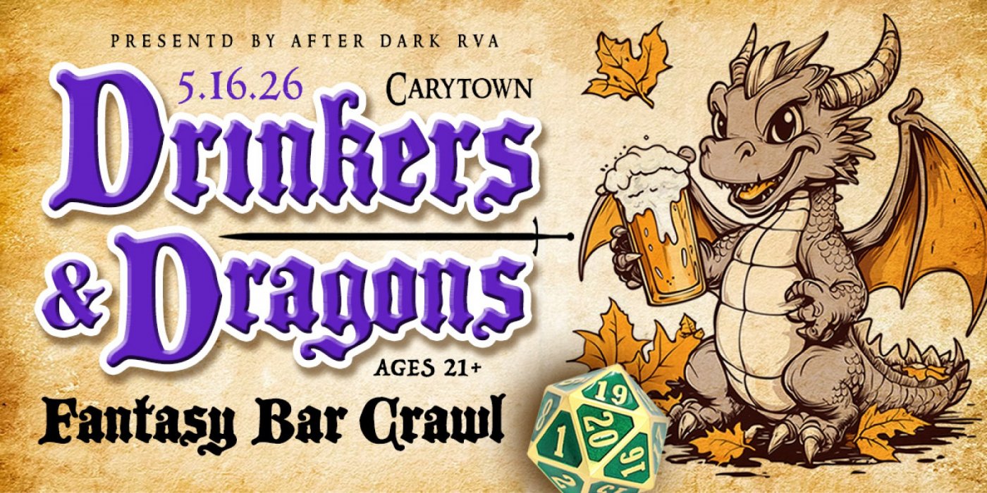 Join us on a fantastical journey like no other as the Carytown DRINKERS & DRAGONS Fantasy Bar Crawl materializes in Spring 2026! Gather your party and surrender to your inner adventurer as you explore Richmond's own Carytown while completing quests and raising a glass (or three!) while making new friends along the way on May 16, 2026!
