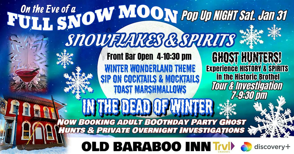 Spookeasy Bar Open 4-10:30 pm for SNOWFLAKES & SPIRITS Pop Up Bar on the EVE of the SNOW FULL MOON! It's Warm and Toasty inside! NO COVER Haunted Amber on Tap! Themed Winter Wonderland Cocktails and Mocktails. Experience History & Spirits!