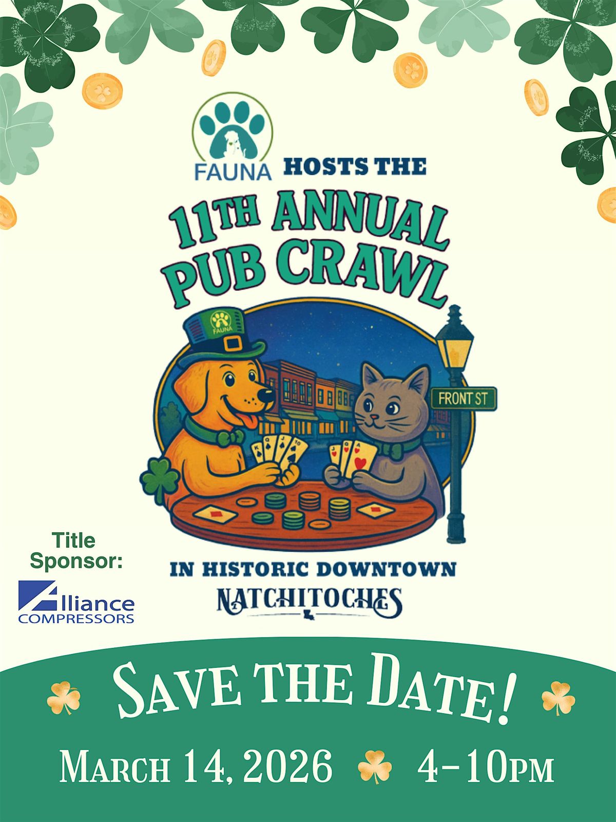 Come join us for a night of fun at the 11th Annual St. Patrick's Day Pub Crawl hosted by FAUNA! Get ready to hop between restuarants, bars, and shops in Historic downtown Natchitoches, LA and enjoy great drink specials, music, shopping and company. Visit all the stops on the "Poker Run" to fill out your card for a change to win a big screen TV, and join in the costume contest as well. Don't miss out on a great way to have fun and support local rescue animals - see you there! T-shirt included with registration (MUST REGISTER BY MARCH 1st to GAURANTEE A SHIRT). *Event takes place rain or shine. *Must be 21 to participate.