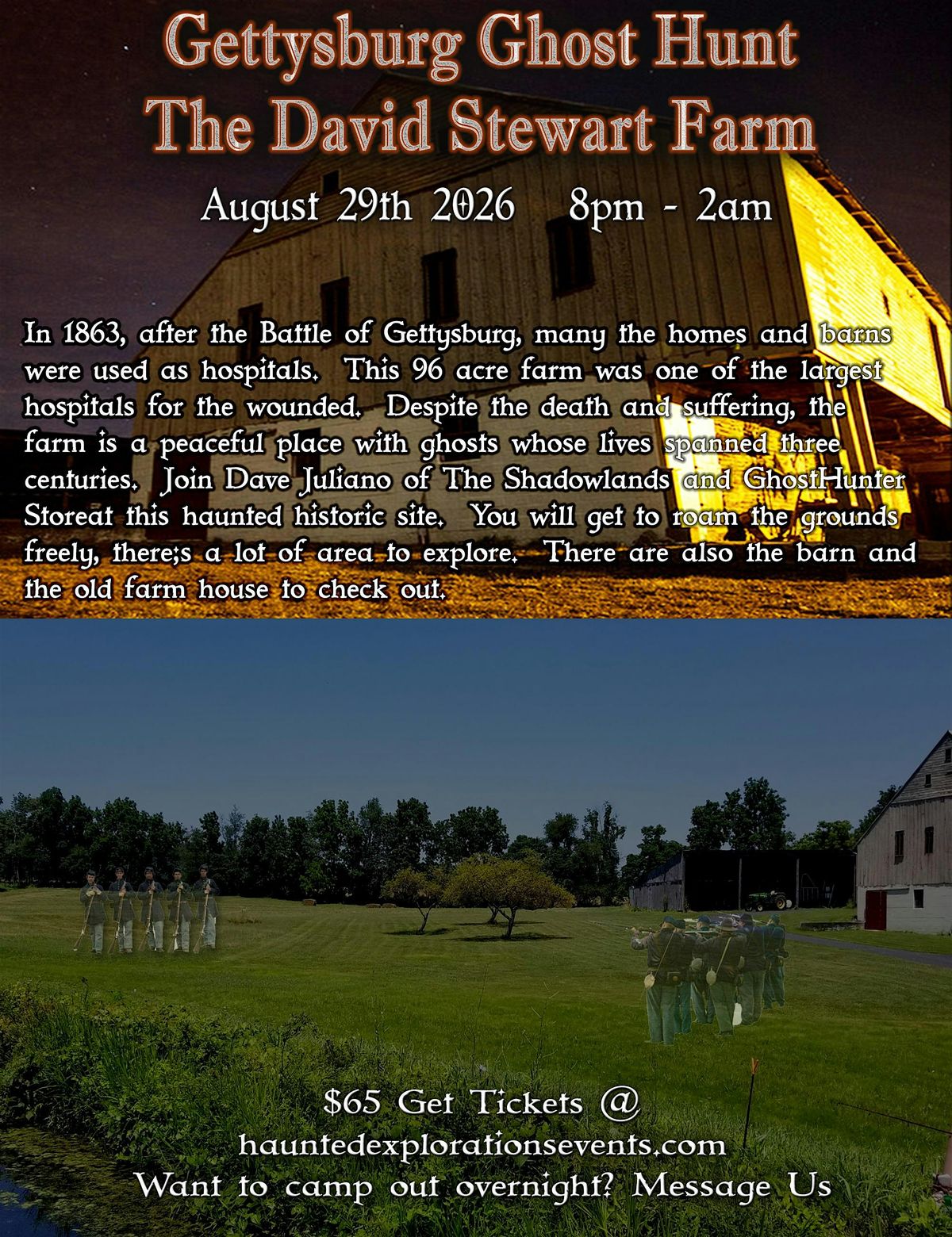 Come investigate the haunted David Stewart farm in Gettysburg with Dave Juliano and Team. In 1863, after the battle of Gettysburg, many of the homes and barns were used as hospitals. This 96-acre farm was one of the largest confederate field hospital. Its right along the road they used as they were leaving Gettysburg the battle. Despite the death and suffering, the farm is a positive place with spirits whose lives span 3 centuries. Some of the claims include phantom footsteps and shadow man in the barn. The area around the farmhouse is very active and there may be a spirit or two inside. The most active place by far are the grounds. They are incredibly active and have been known for an entire regiment being seen in the field. Plan to do a lot of outside investigating on over 96 acres of civil war history!