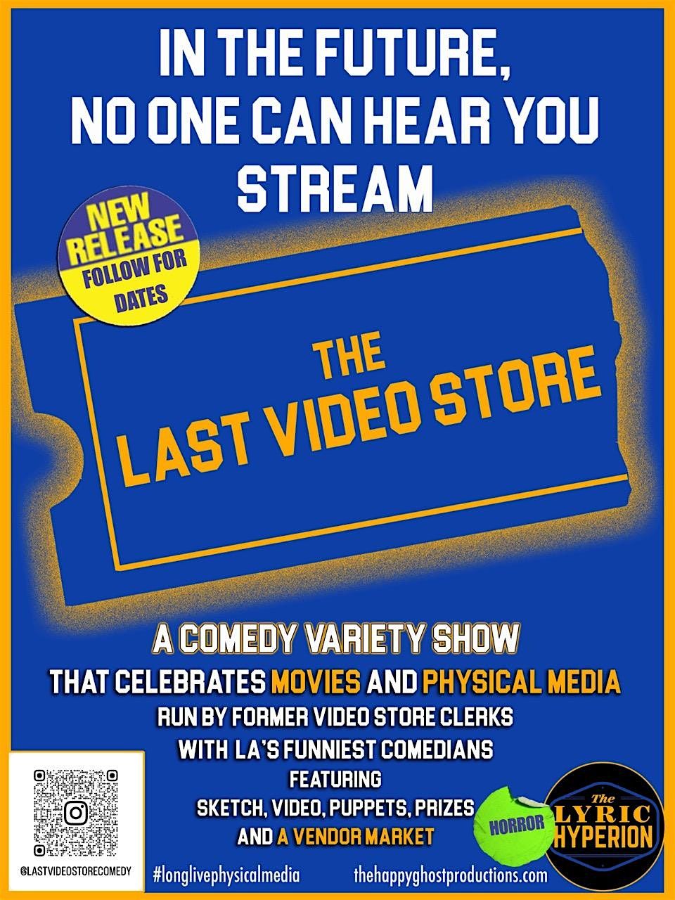 Join the employees of the Last Video Store as we celebrate all things physical media. What Special guests will arrive to rent and return videotapes? How many Late Fees will the Overnight Returns Box Monster demand? What prizes will we give away to those weary travelers looking for a break from downloading 40 channels to their Roku? and will evil War Lord David Zaslav finally find the location of the store and destroy all its movies?