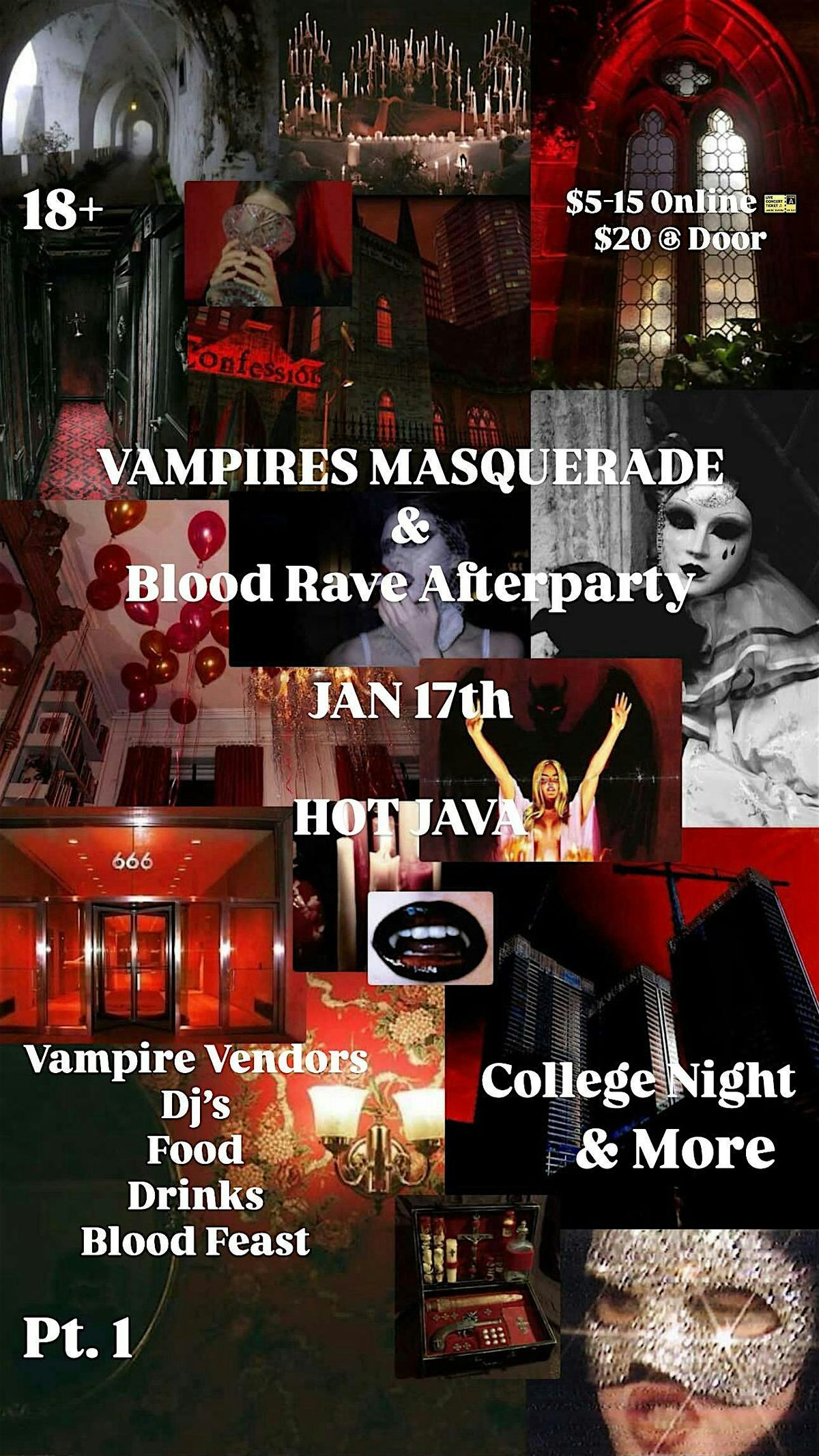 Vampire’s Masquerade Jan 17 | 7PM–2AMMasquerade → Blood Rave afterparty. Blood Feast, Smash Bros, vendors. 18+. Masks encouraged. College+